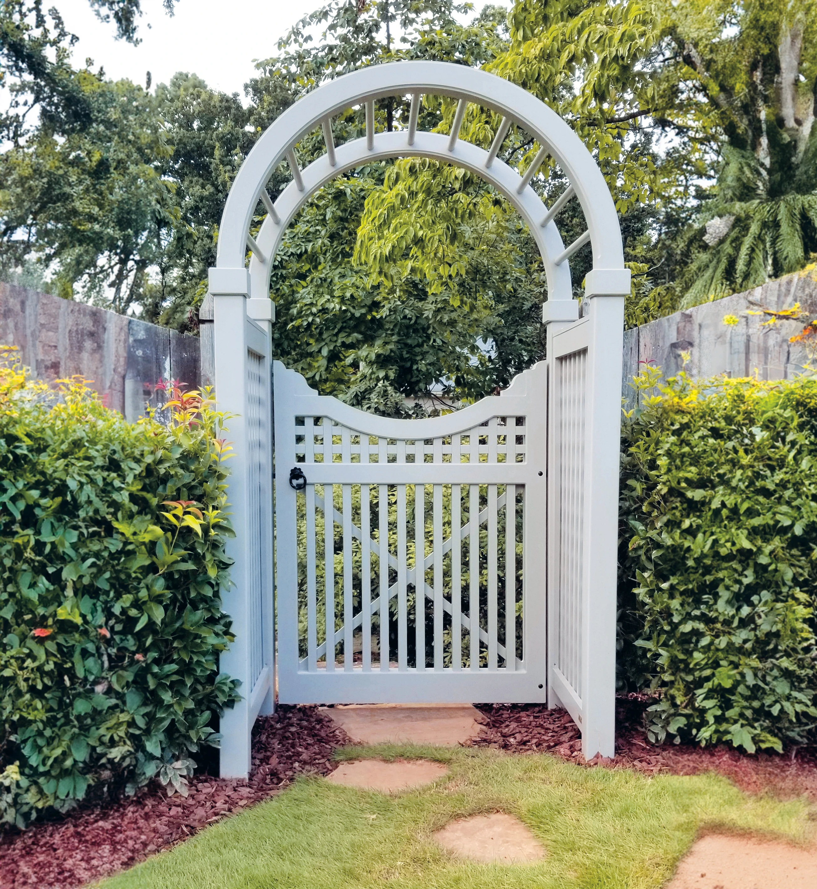 The Hampton Single Gate (arbor, posts and caps sold separately) has decorative styles and a scalloped top that curves from 5'H to 4'4"H at center. The picket has a half-lapped lattice topper and includes black powder coated 12" heavy reversible hinges, a ring latch and cane bolt. Choose an arbor of your choice, 5½" posts and caps (both sold separately), or place between your existing supports. Prefinished white. *Pricing is for the gate only. Does not include posts or arbor.