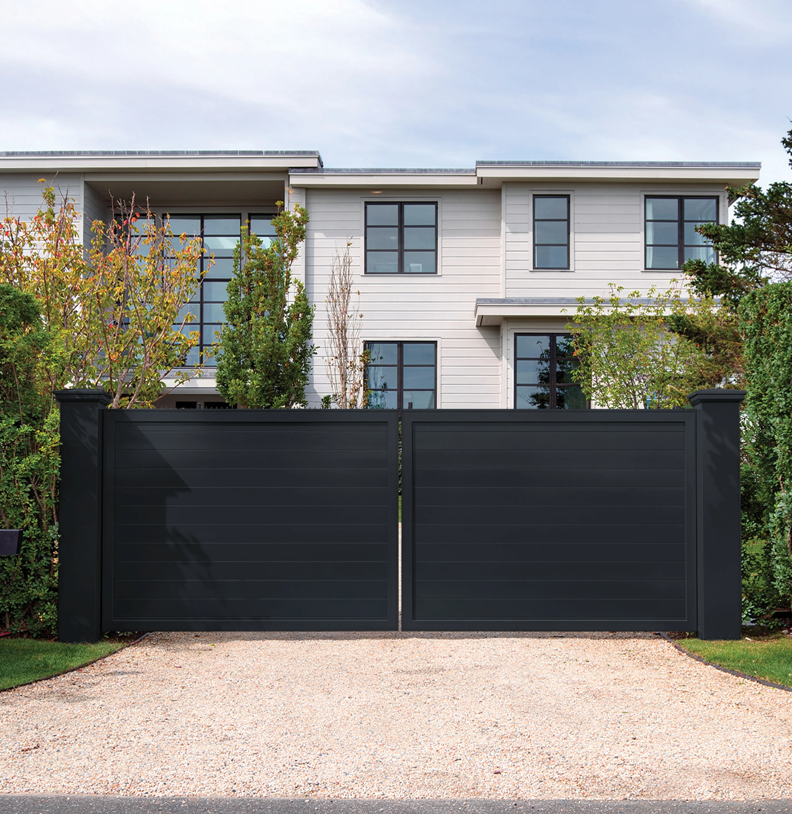 This drive gate is a superb combination of security and contemporary elegance. Available with Wenham, Darien, Bostonian pillars or masonry columns. Available 4'H to 8'H and 12'W to 18'W.