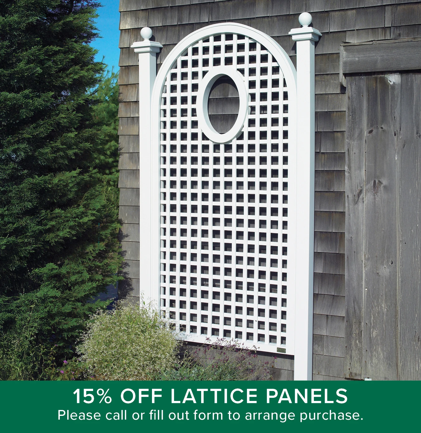 The symmetry of the horizontal-vertical lines is juxtaposed with the charming oval. Panel has a curving arched top with cap and is 8' H, 4' W. Oval cut-out is 18" H x 12" W. Horizontal/vertical lattice opening is 2.5" square. Lattice thickness is 0.625" by 1.125". Decorative sphere cap. Crafted in Solid Cellular Vinyl. Allow 30" to 36" for burial of 4" square posts. Prefinished white.