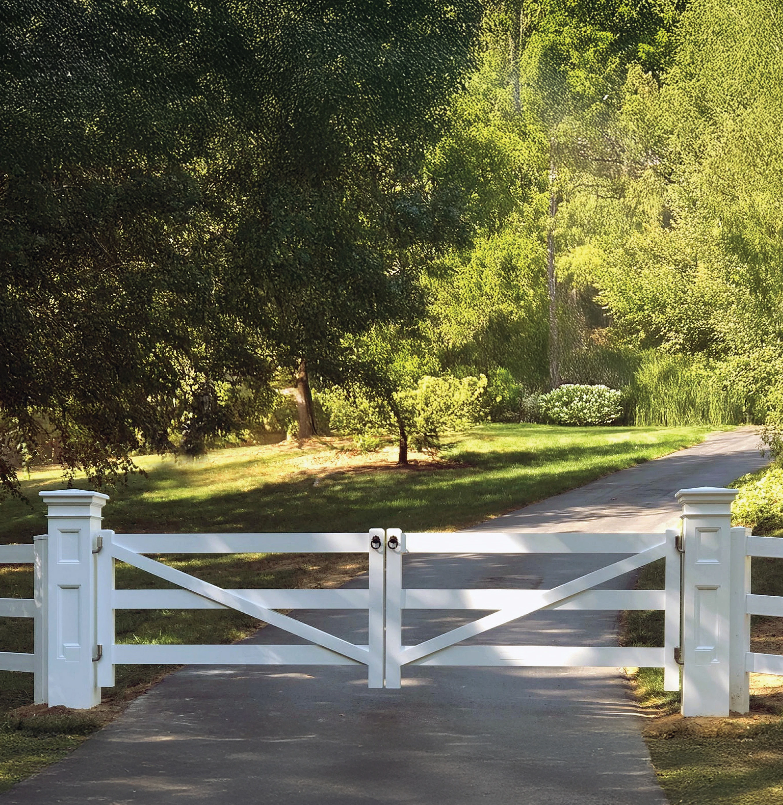 A sturdy, orderly gate that protects your driveway with authority. Available with straight top and Wenham, Darien, Bostonian pillars or masonry columns. 3'H-5'H. 12'-20'W.