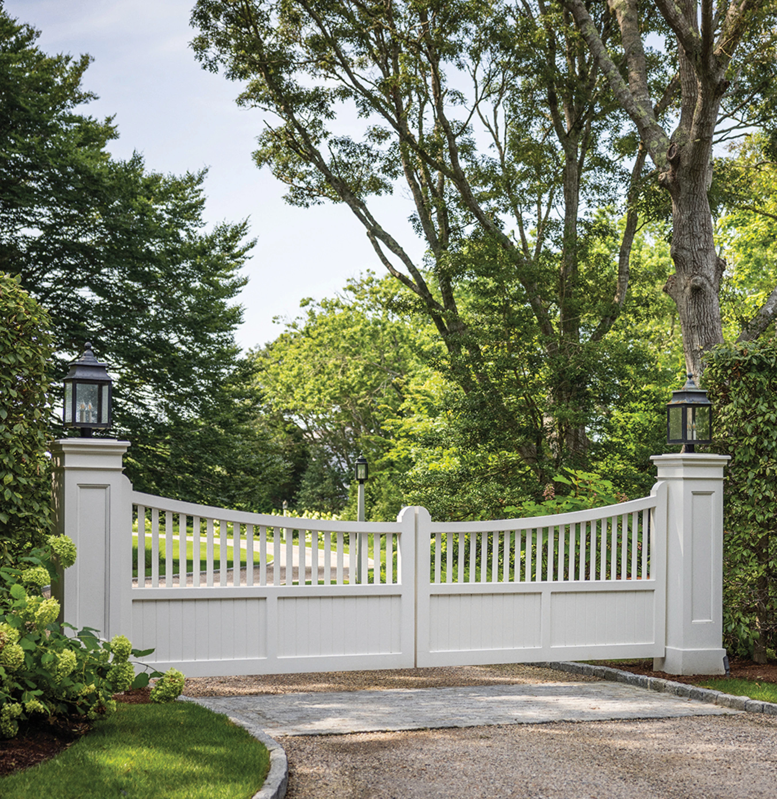 Capped Yorktown pickets meet an elegant board bottom to create this charming drive gate that provides greater privacy. Crafted in solid cellular vinyl and prefinished white. 4'H - 8'H. 12'W - 18'W. Available with straight, scallop, and arch tops, as well as an optional Arch Brace in widths 5' and over. Choose board, raised, or recessed panel bottoms.