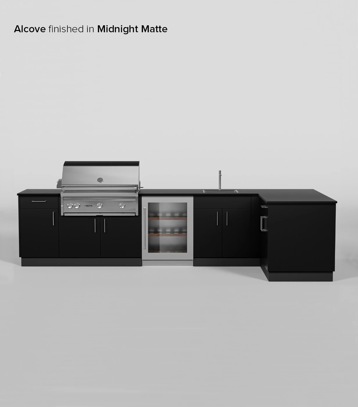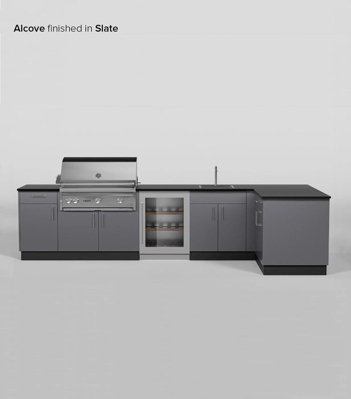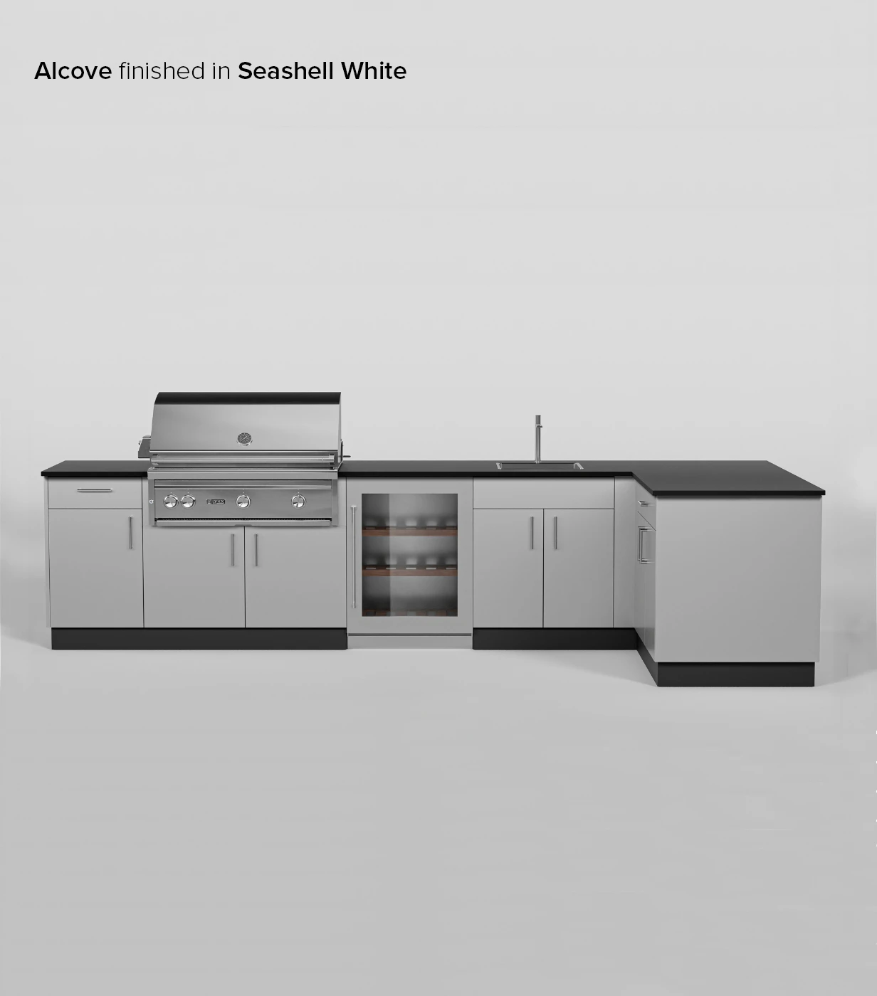 The most generous layout for storage, Alcove Signature Kitchen is complete with cabinetry for a grill, sink, and refrigerator. This L-shaped configuration offers ample counter space for all your cooking requirements. Note: This layout only fits 36” grills.
