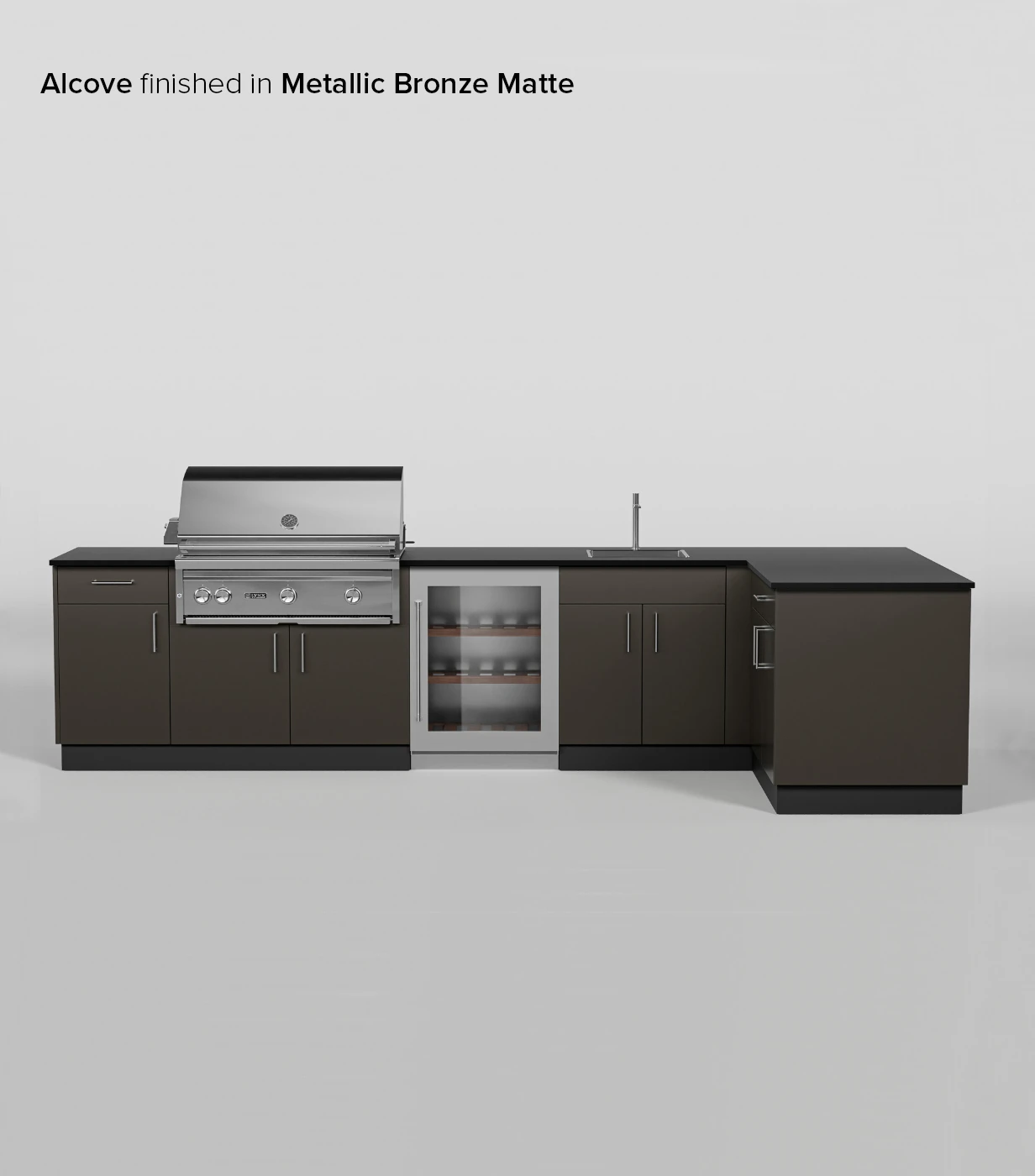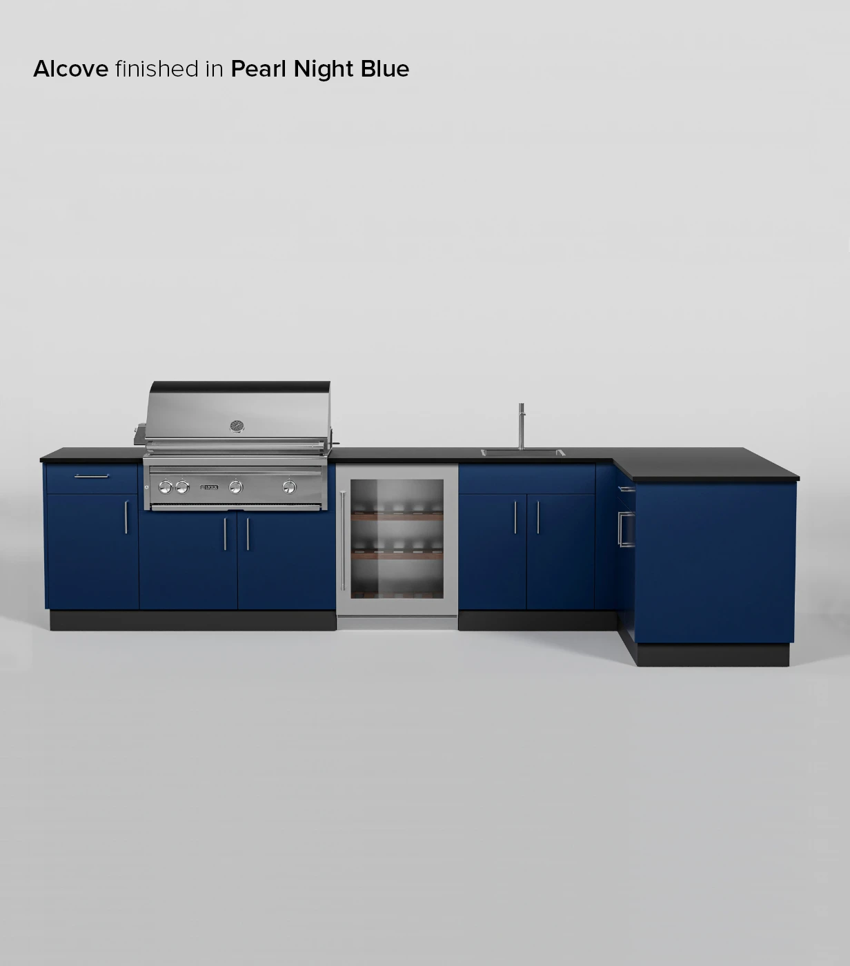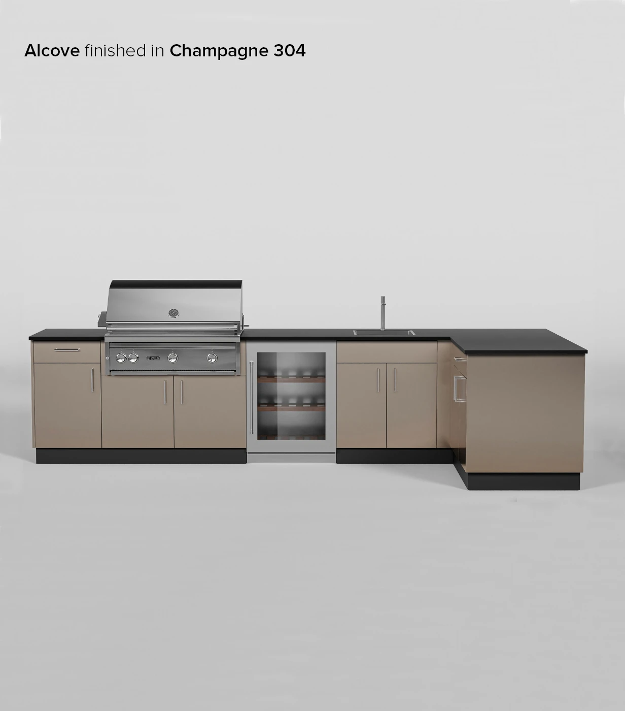 The most generous layout for storage, Alcove Signature Kitchen is complete with cabinetry for a grill, sink, and refrigerator. This L-shaped configuration offers ample counter space for all your cooking requirements. Note: This layout only fits 36” grills.