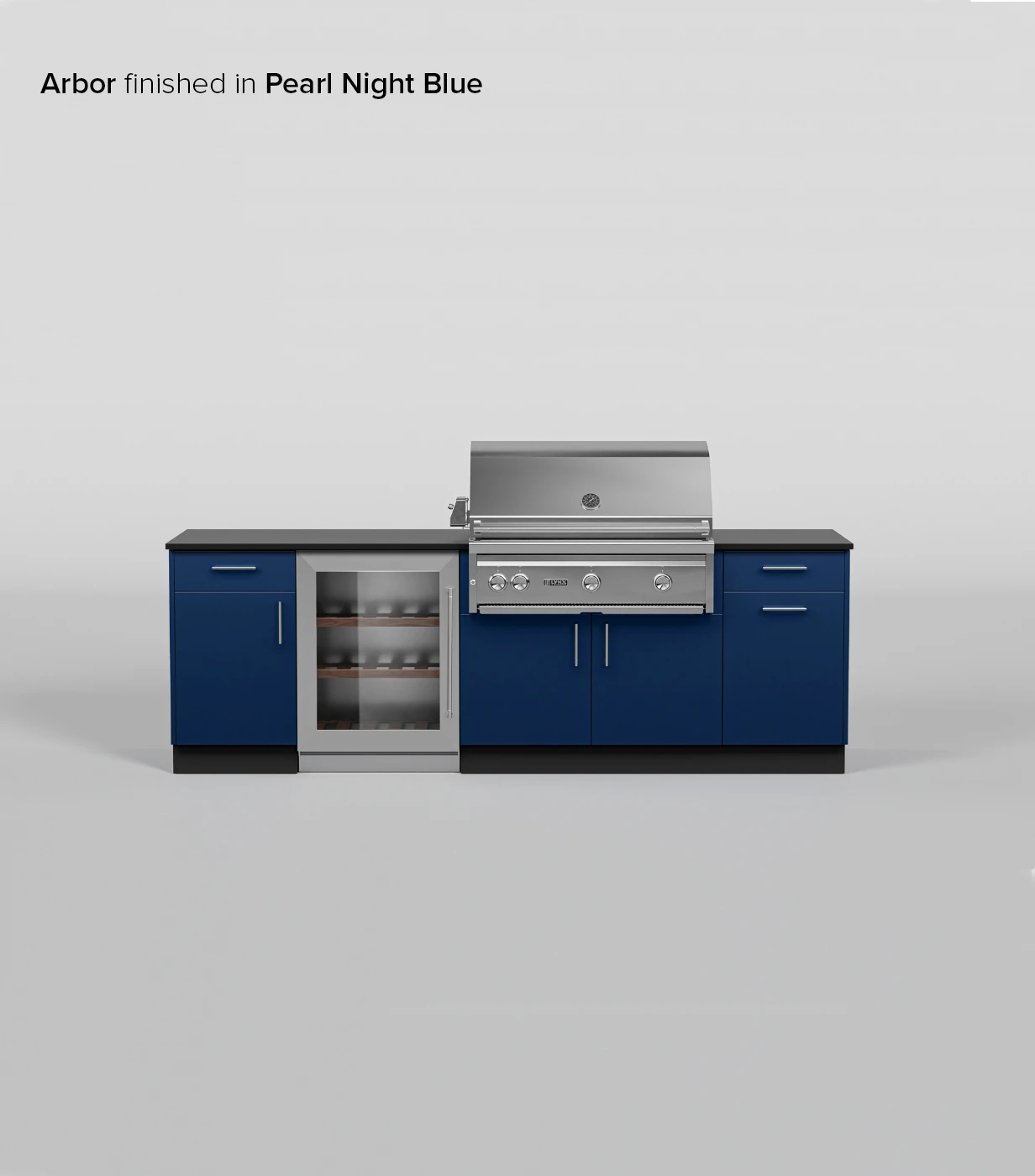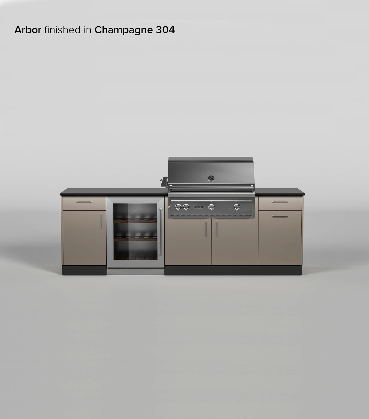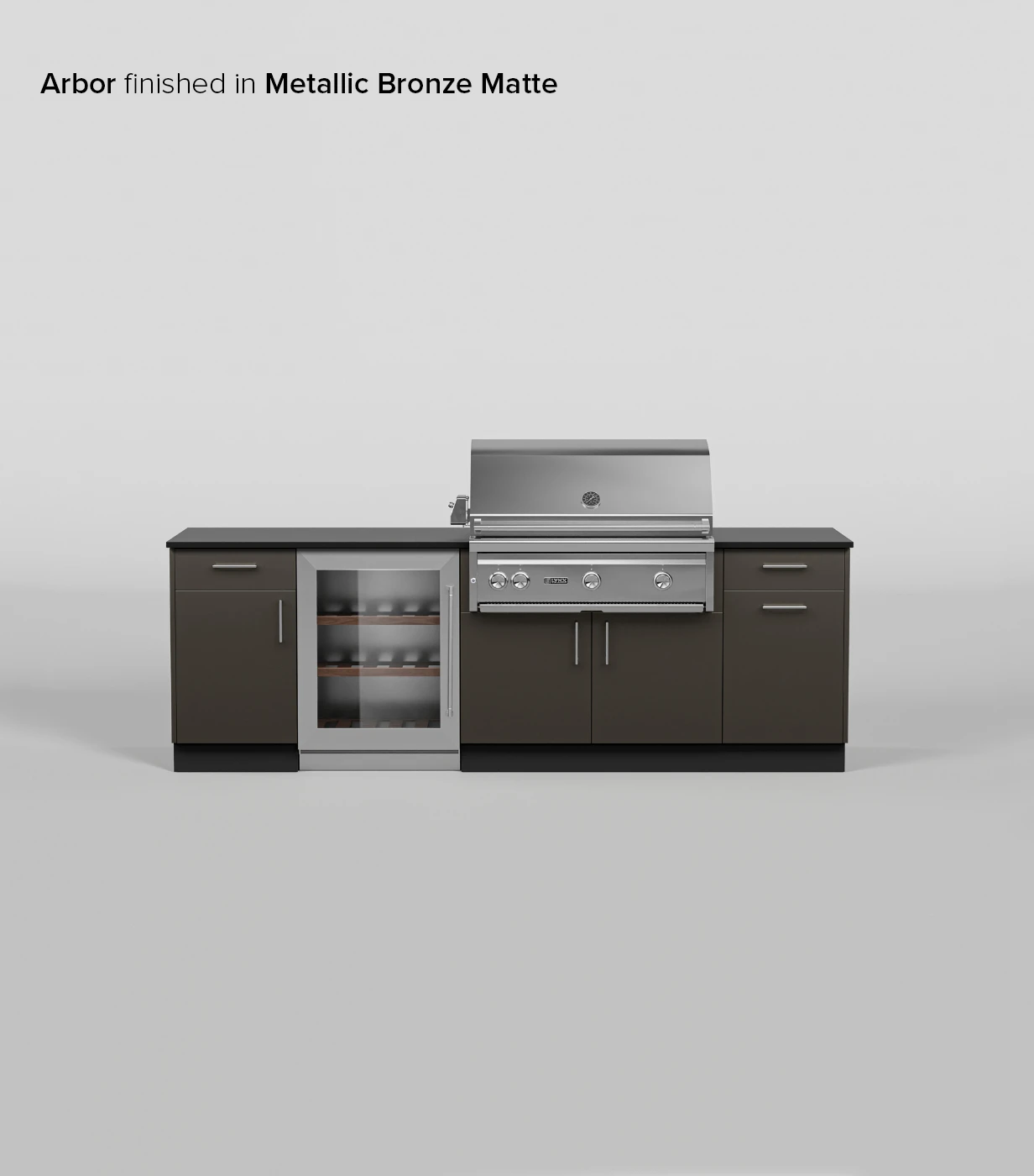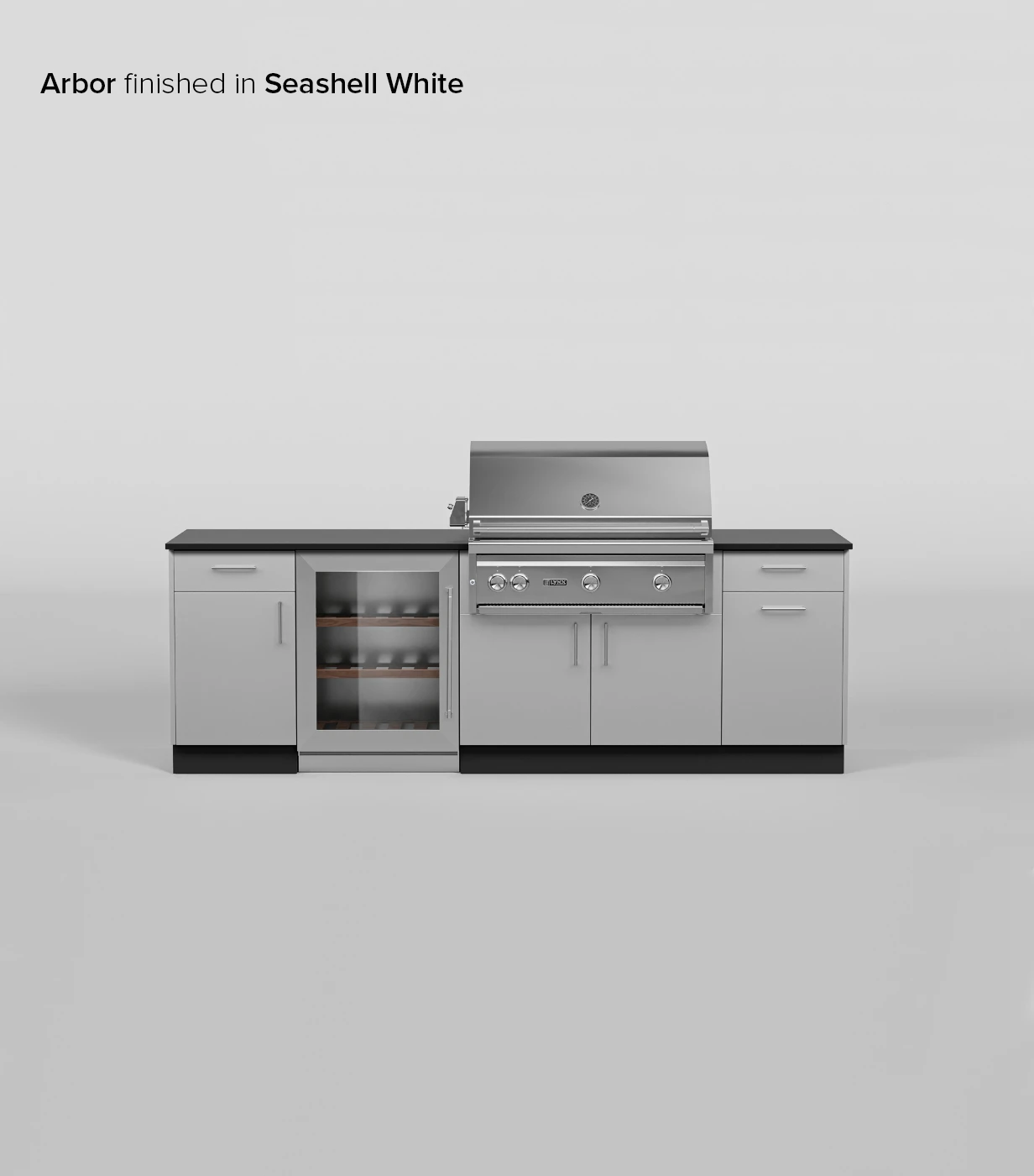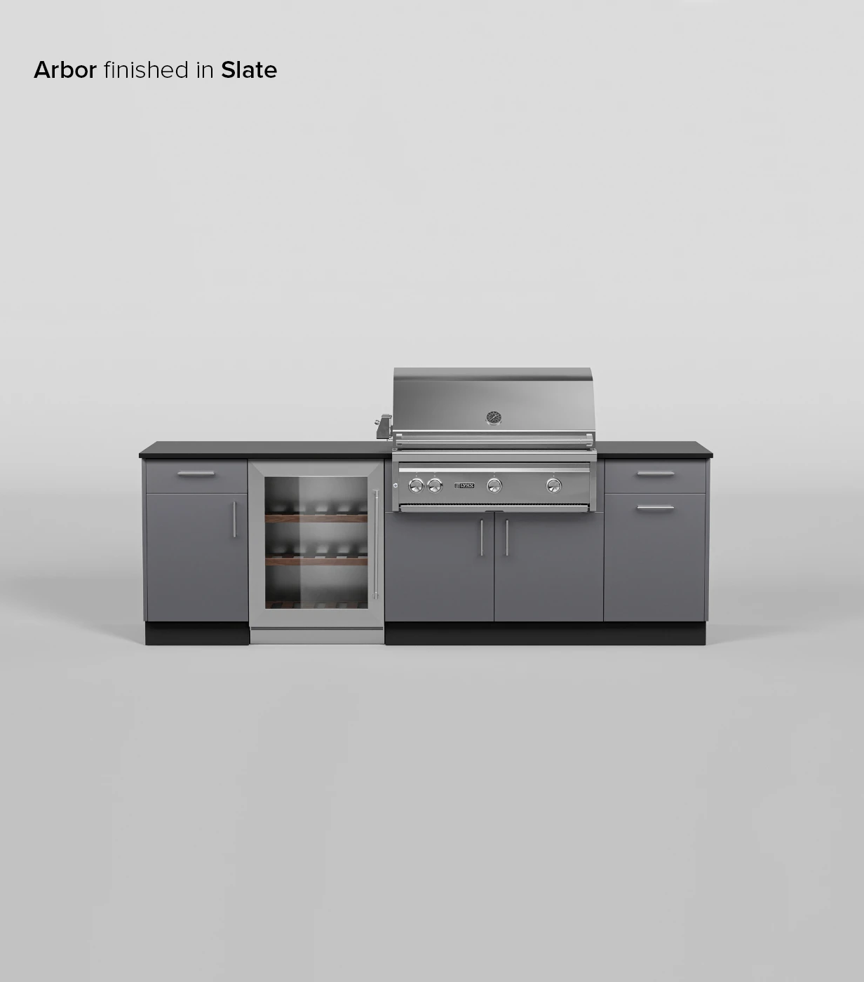Designed with entertainment in mind, the Arbor Signature Kitchen adds a refrigerator space and additional workspace on the left side of the of the grill cabinet. It is rounded out with a trash pull-out cabinet and storage.