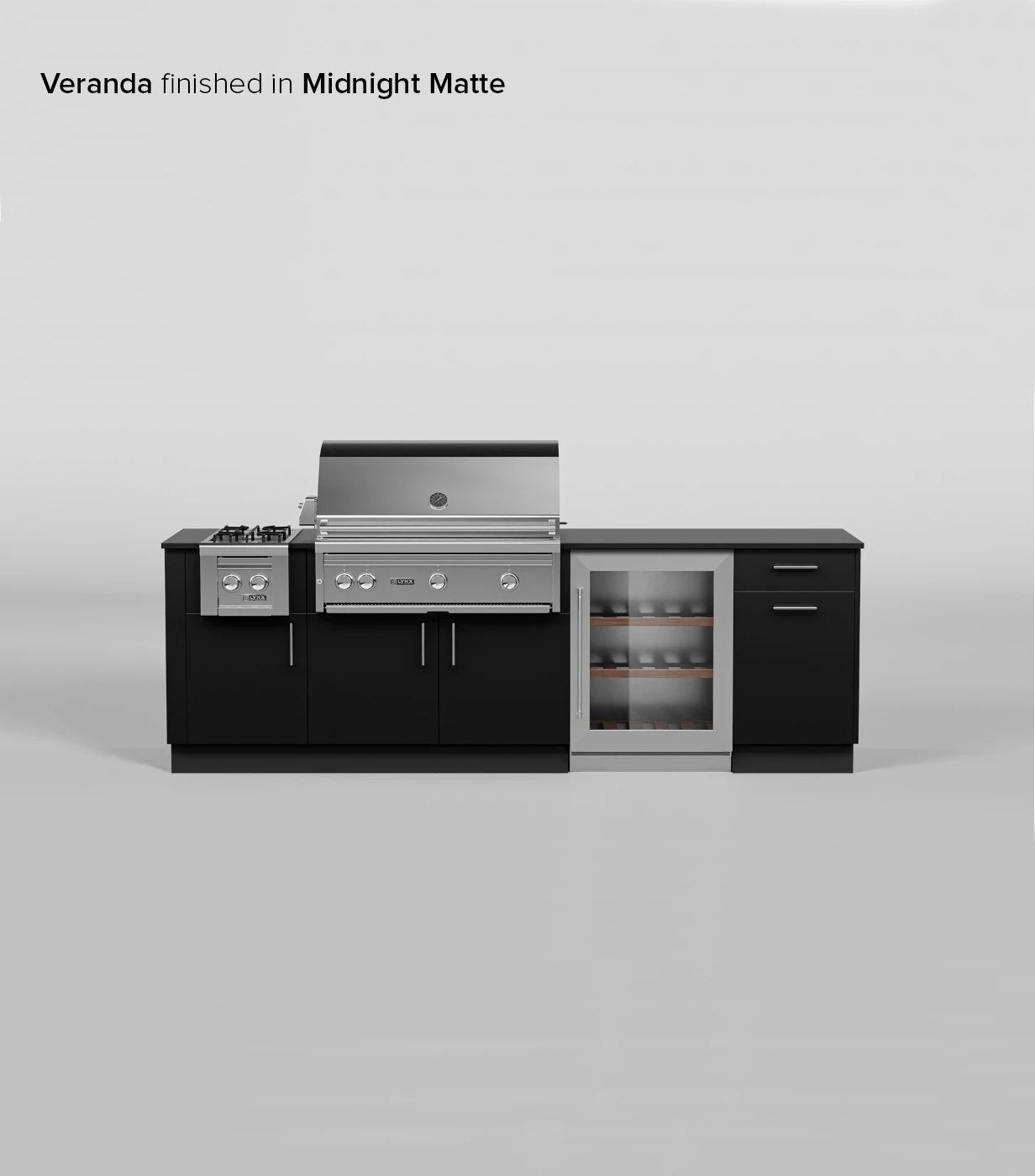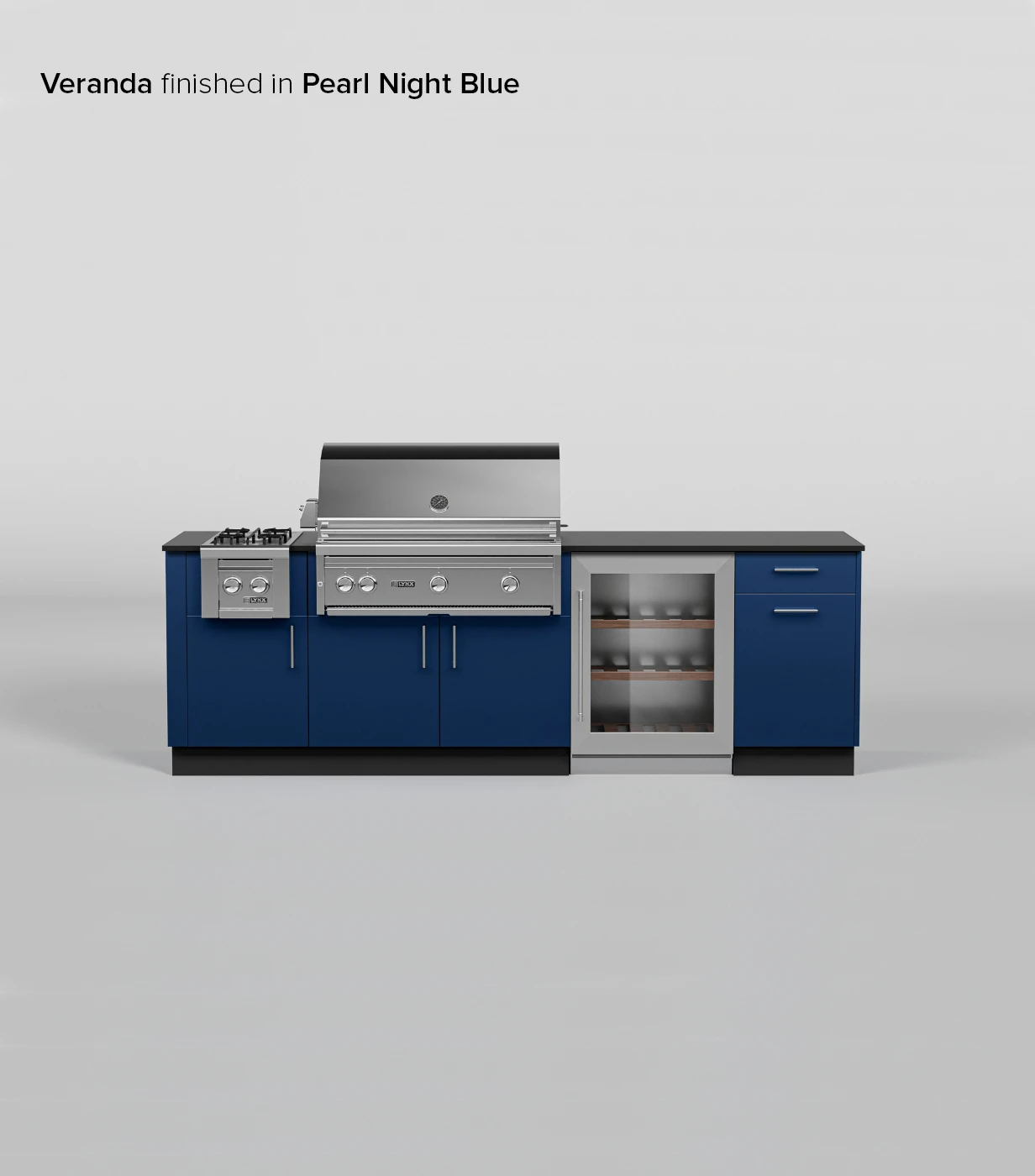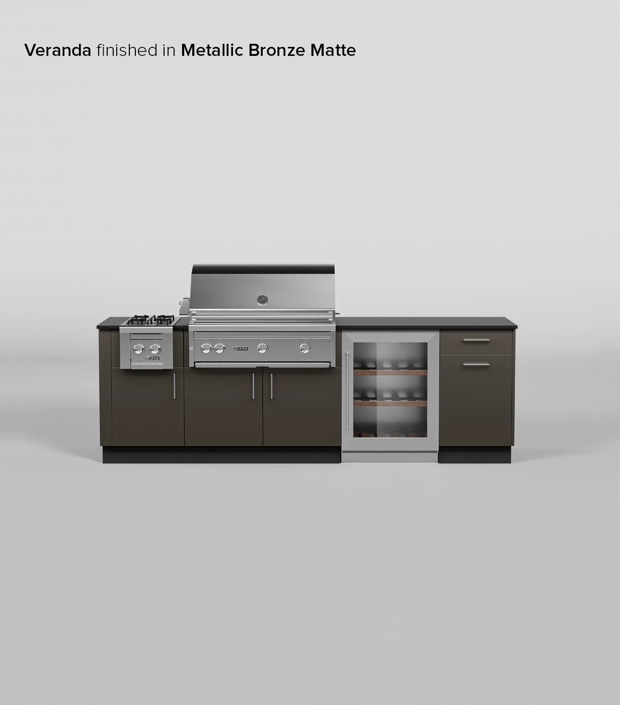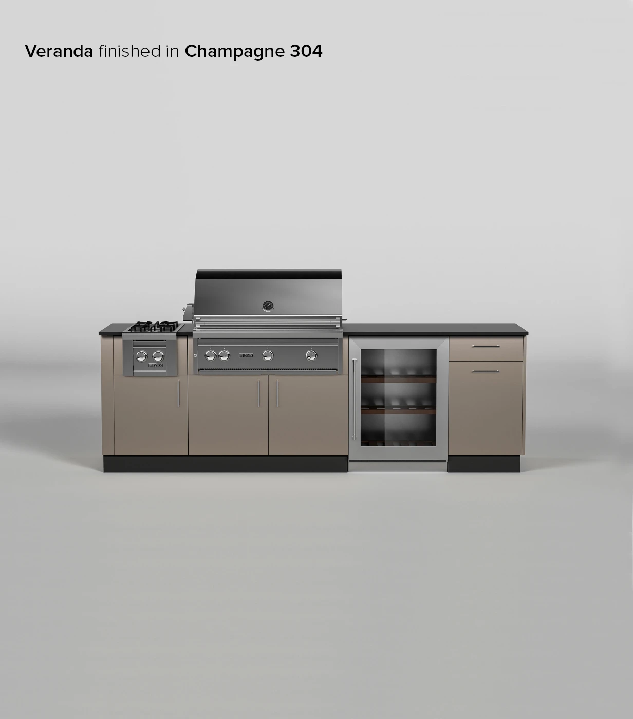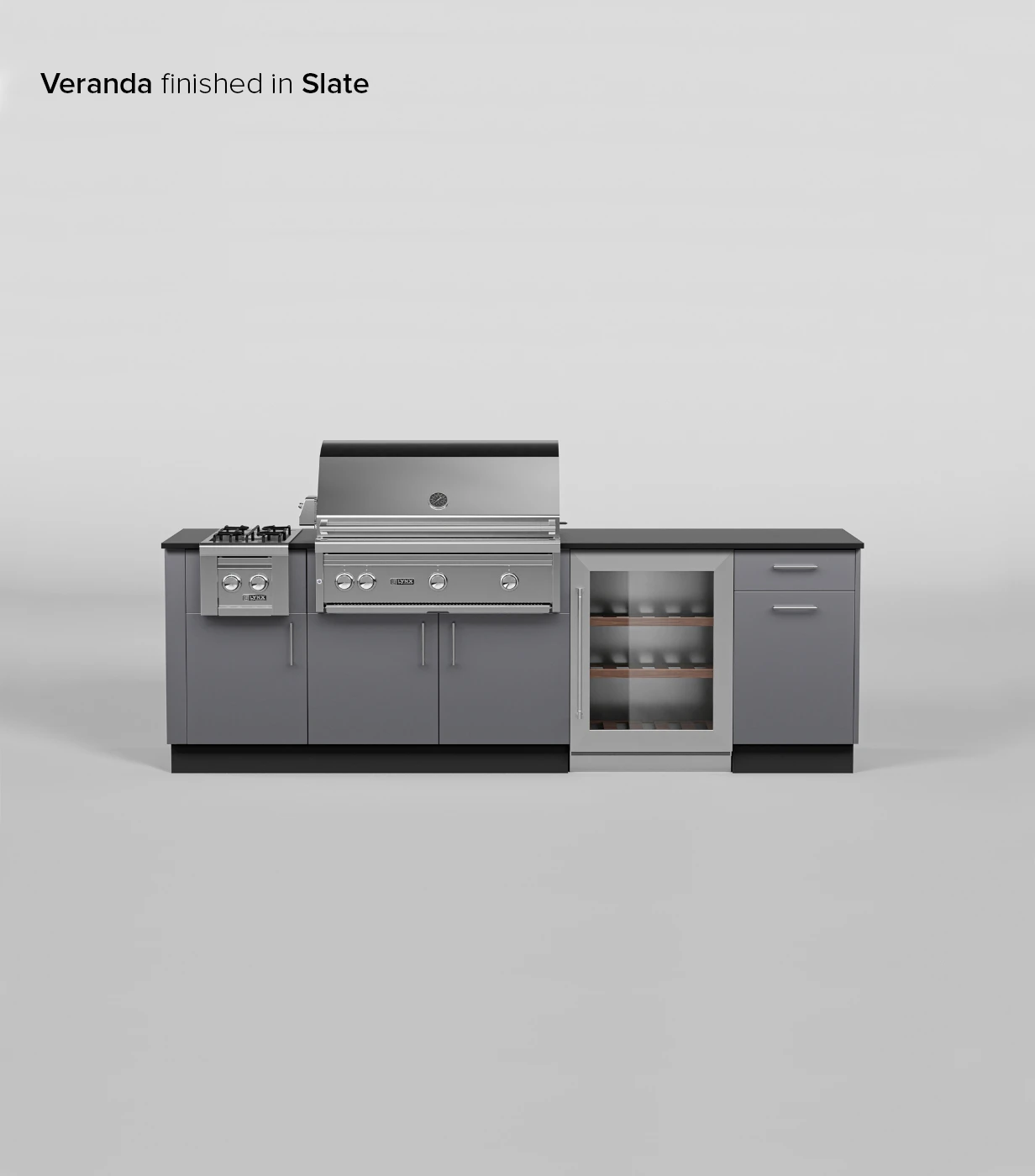 Veranda Signature Kitchen offers additional cooking capabilities with a side burner cabinet next to the grill cabinet. It includes a refrigerator space and a trash pull-out cabinet for easy food prep and clean-up