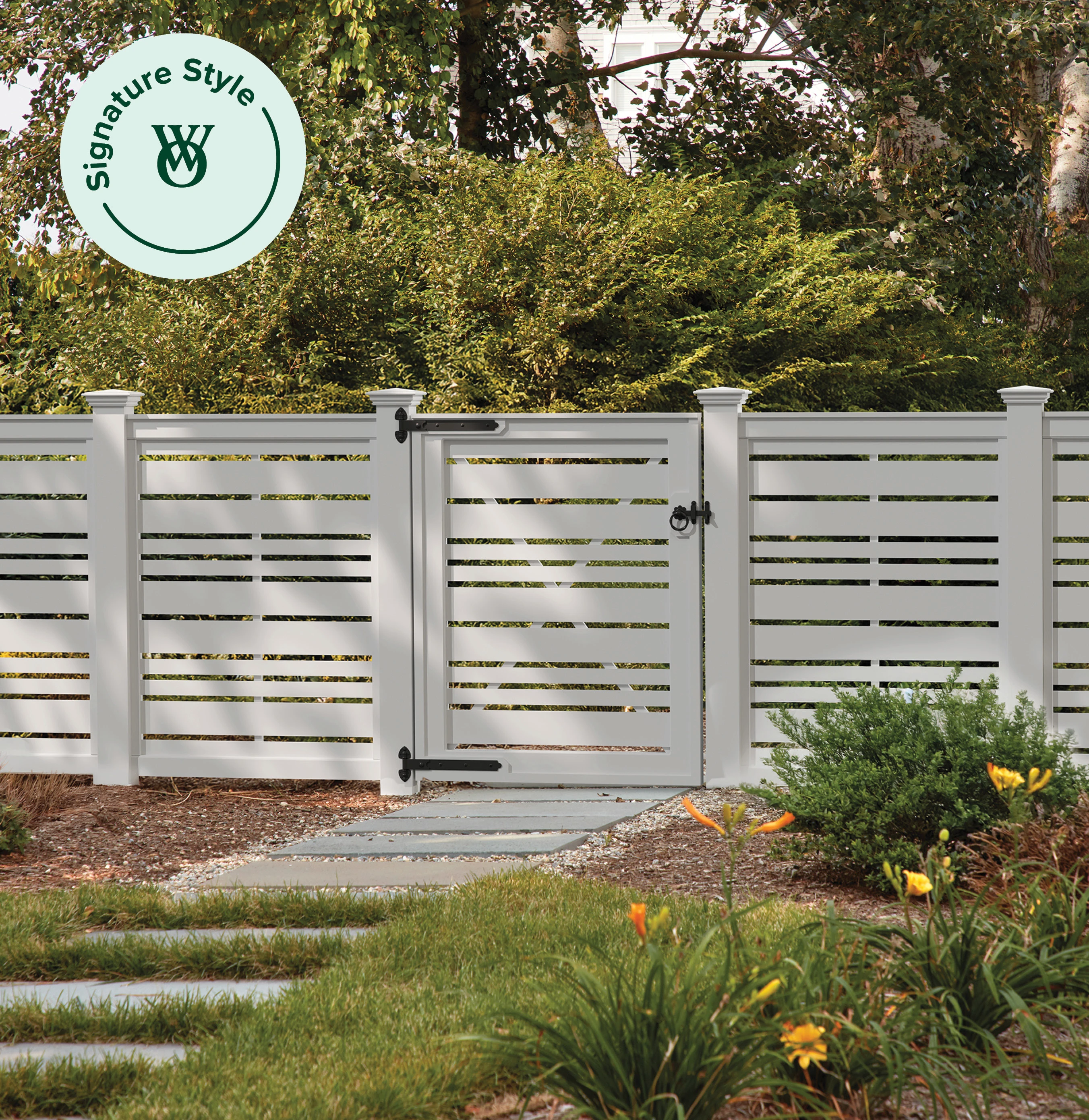 With its crisp lines and spaced horizontal boards, this fence offers a modern, architectural presence that complements today’s outdoor spaces. The clean, minimalist design delivers both form and function—creating a stylish boundary that defines your yard without feeling closed in. 5½'' square posts. Available 4'H to 6'H. Solid Cellular Vinyl only.
