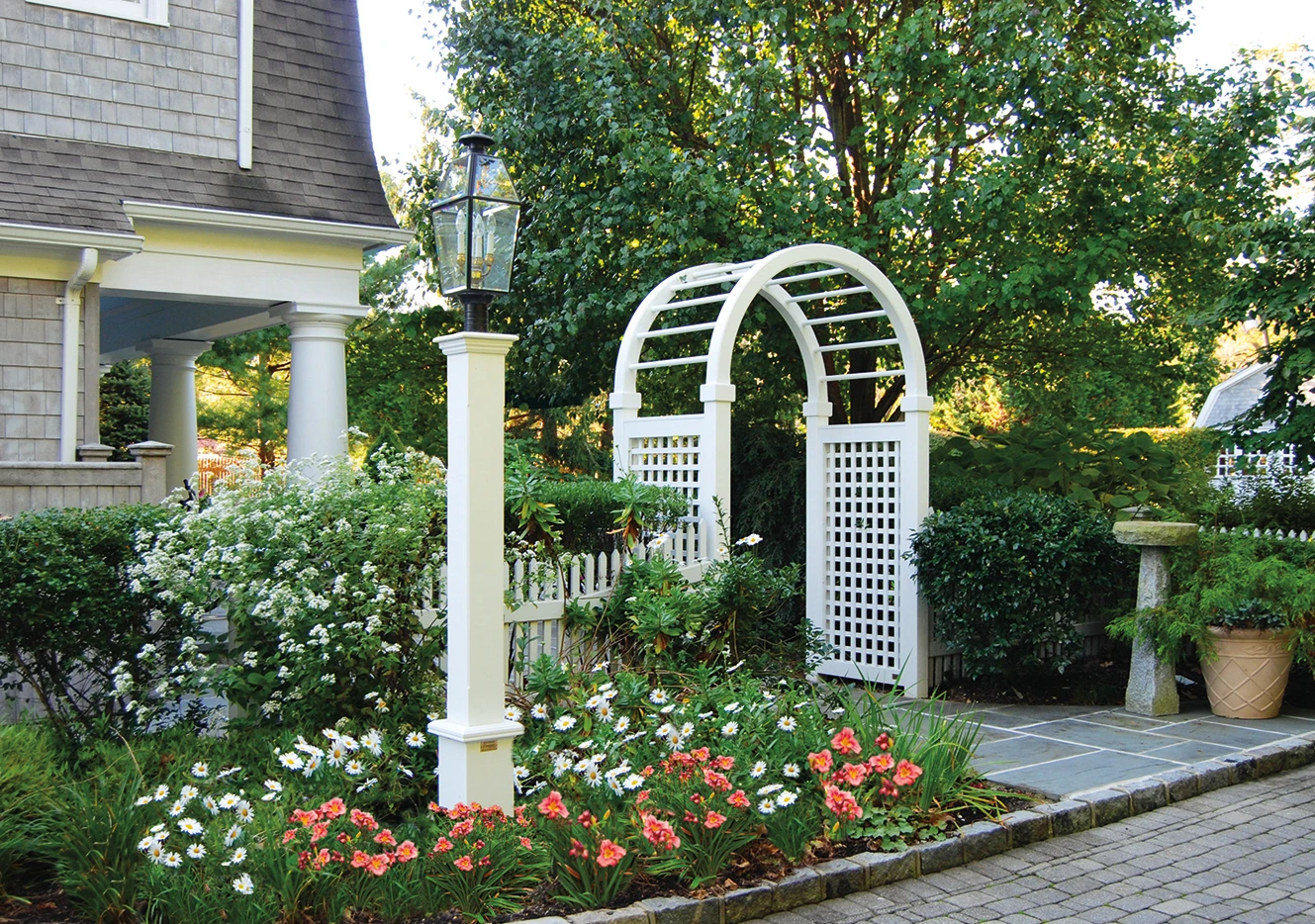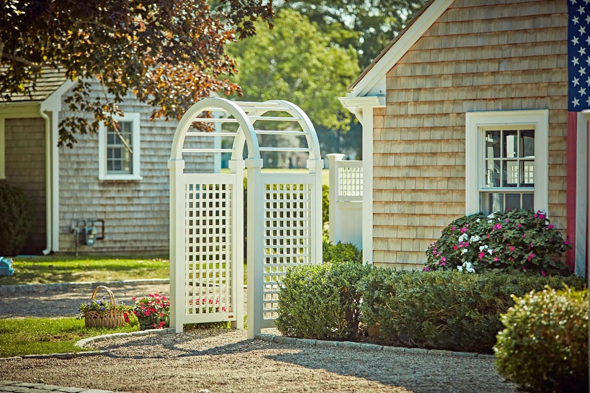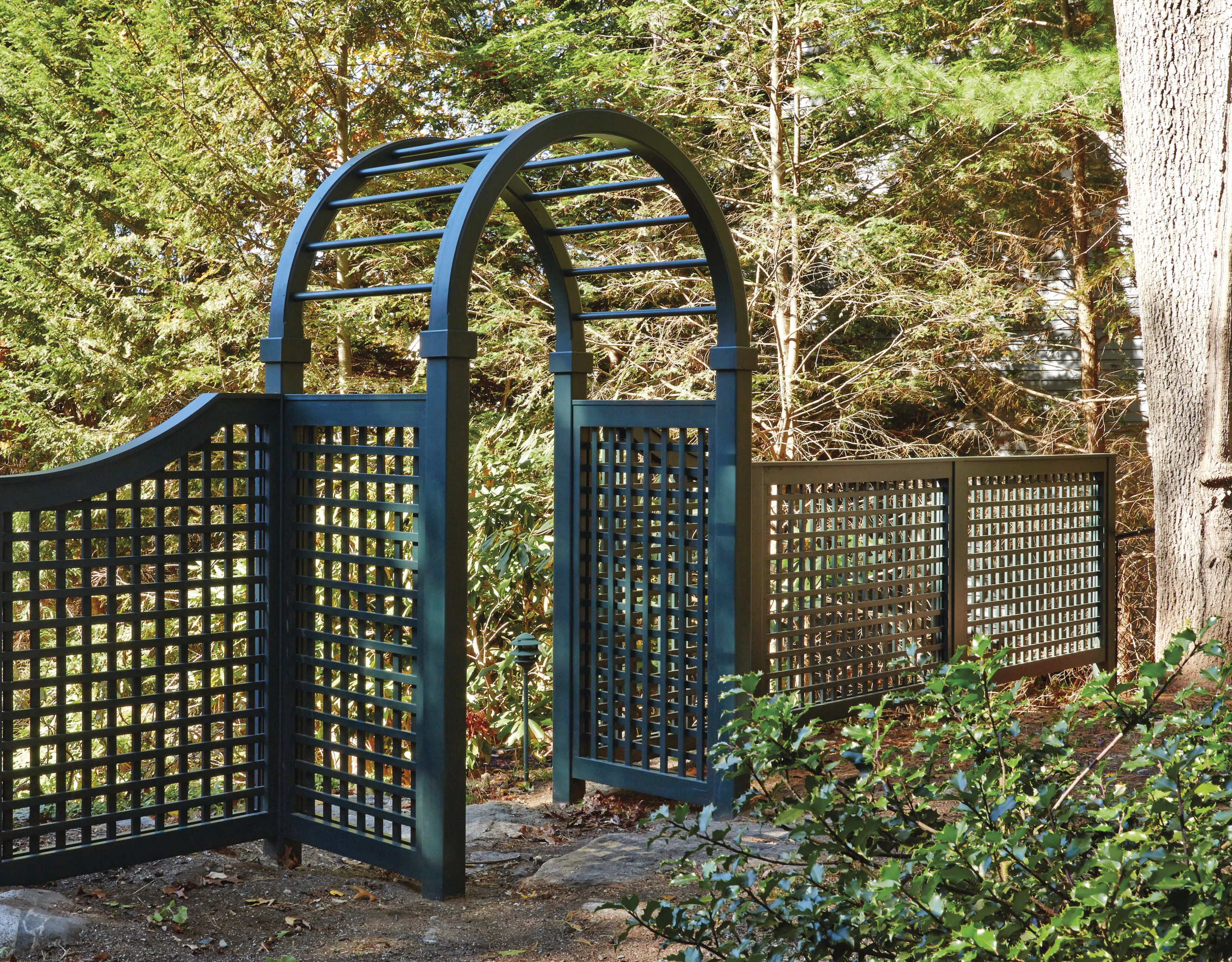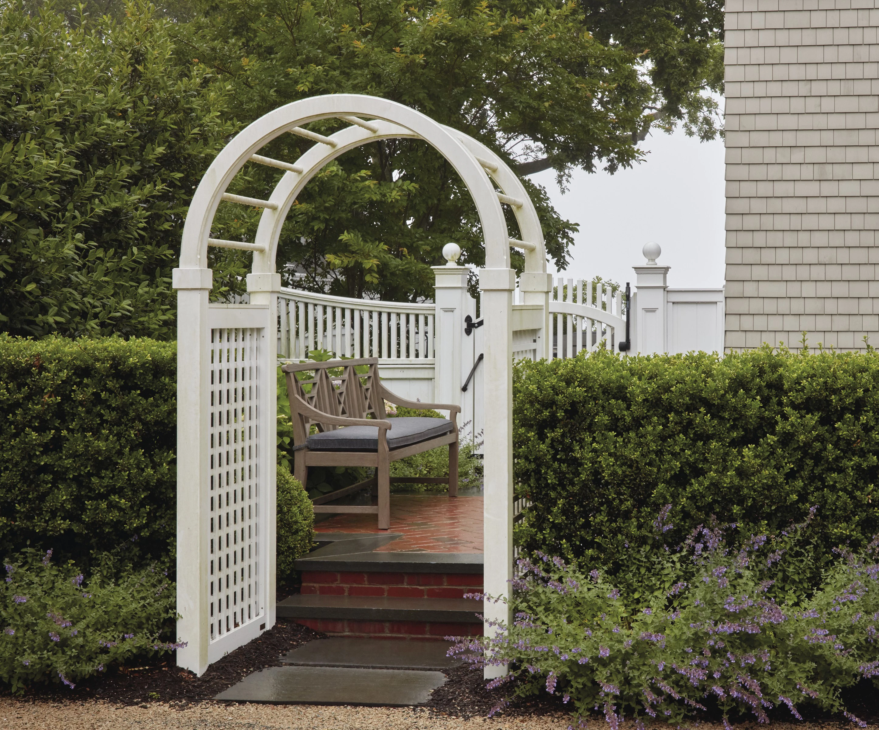 Crafted in Solid Cellular Vinyl with 4" square posts with 3½" square arch. 5' H horizontal/vertical lattice side panels. 38"D. Available 3½', 4', 4½' and 6'W. Prefinished white.