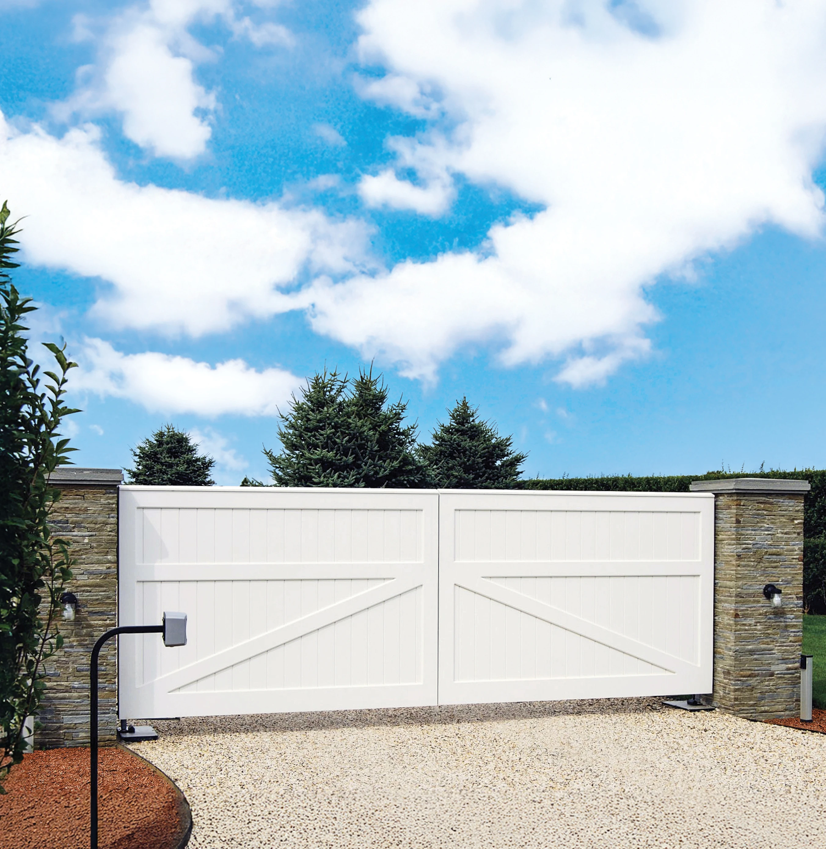 A dignified and practical gate that delivers privacy and security. Available with straight, arched, or scalloped top and Wenham, Darien, Bostonian pillars or masonry columns. 4'H-8'H. 12'W-18'W.