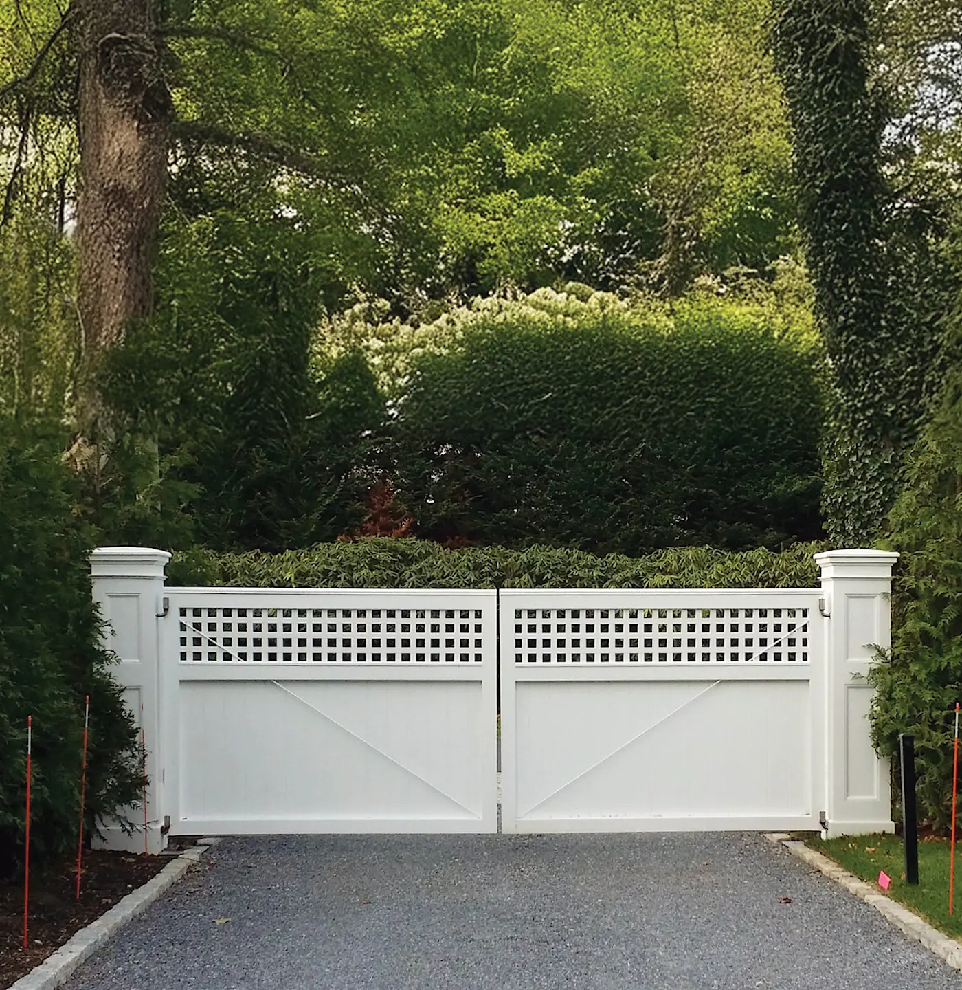 A lattice topper adds style to a stately board fence, creating privacy with a light and airy style. Available with straight, arched, or scalloped top and Wenham, Darien, Bostonian pillars or masonry columns. 4'H-8'H. 12'W-18'W.