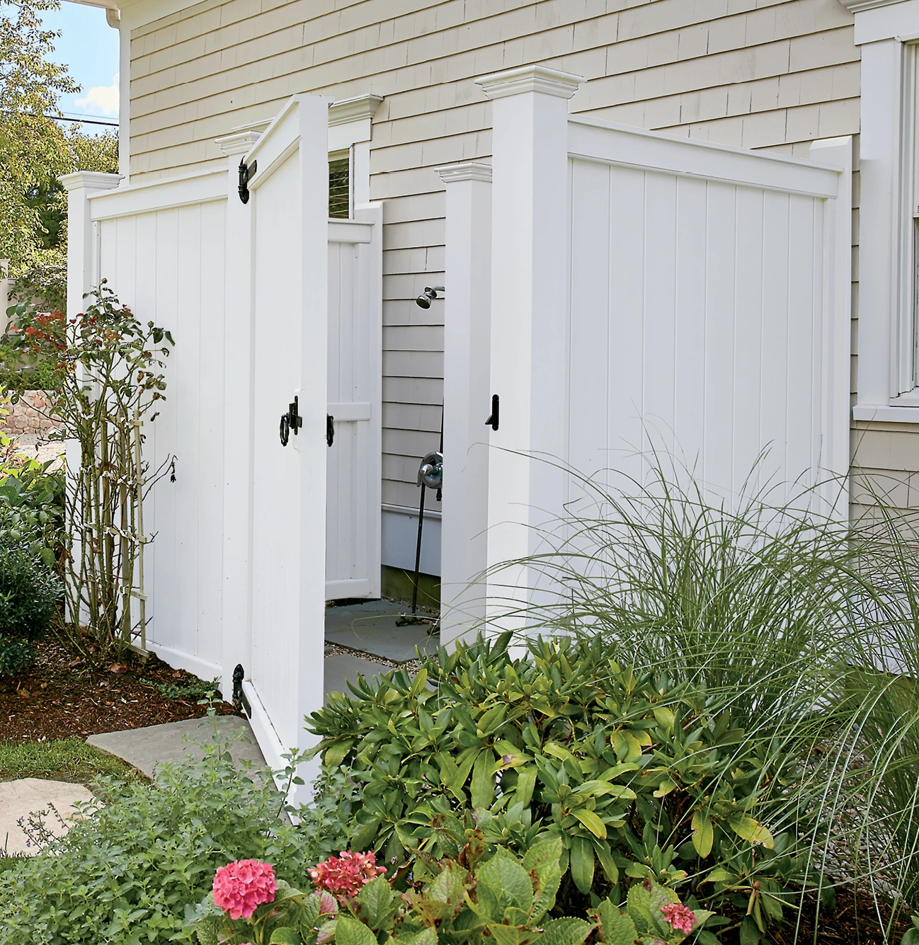 A simple enclosure you can attach to your house, cabana or garage, this shower enclosure is designed to attach with cleats (supplied) to a vertical wall. The Universal board style shower enclosure provides an elegantly designed addition to any backyard. Offered in Solid Cellular Vinyl or Northern White Cedar and available in three sizes to suit a variety of space requirements. Shower decking is offered as a customization option (sold separately). Shown in photo: Universal Chatham in CPVC.